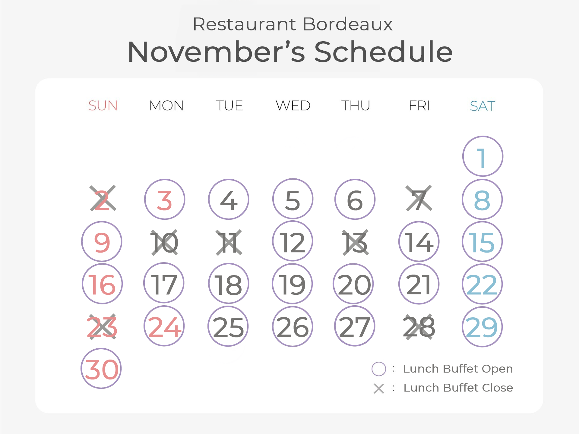 *Closed day: 2, 7, 10, 11, 13, 23, 28