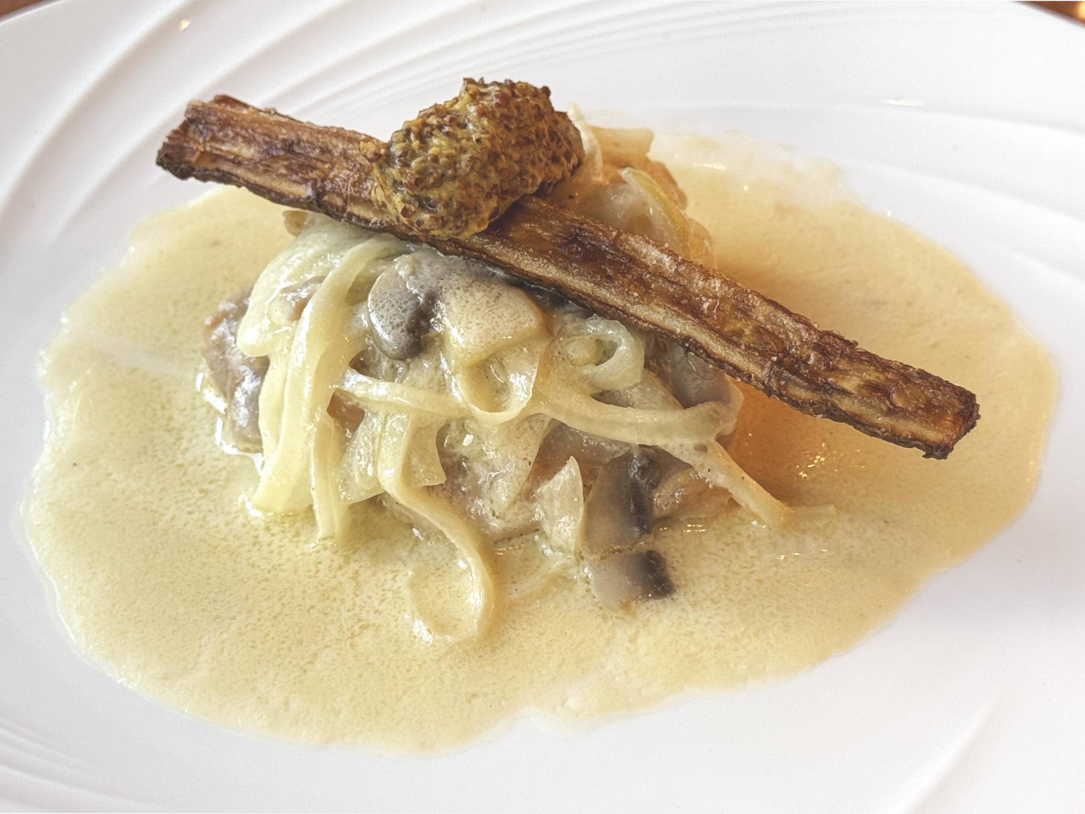 ①鶏もも肉の軽い白ワイン煮込みに牛蒡のフリット添え (月替わり)