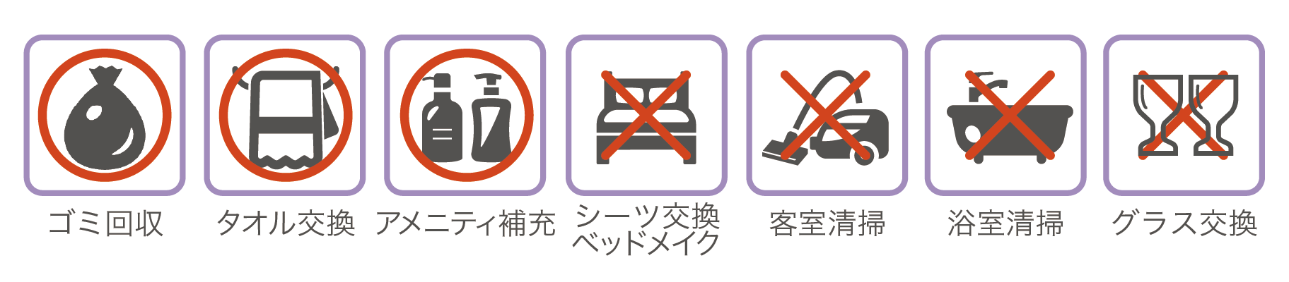 この取り組みの一環として、2025年7月1日チェックインより、ご連泊のお客様におかれましては、滞在中の客室清掃を「エコ清掃(ゴミ回収・タオル交換・アメニティ補充)」とさせて頂きます。