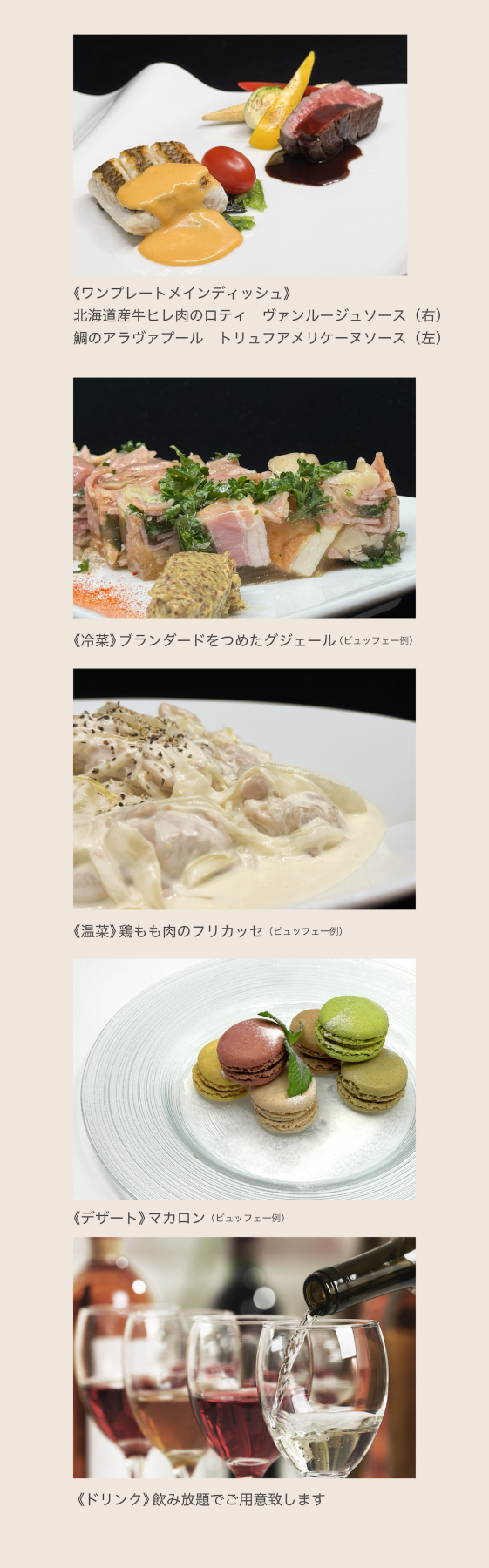 お肉とお魚の”ワンプレート”メインディッシュに、ワインに合うフレンチメニューをビュッフェスタイルでご提供致します。