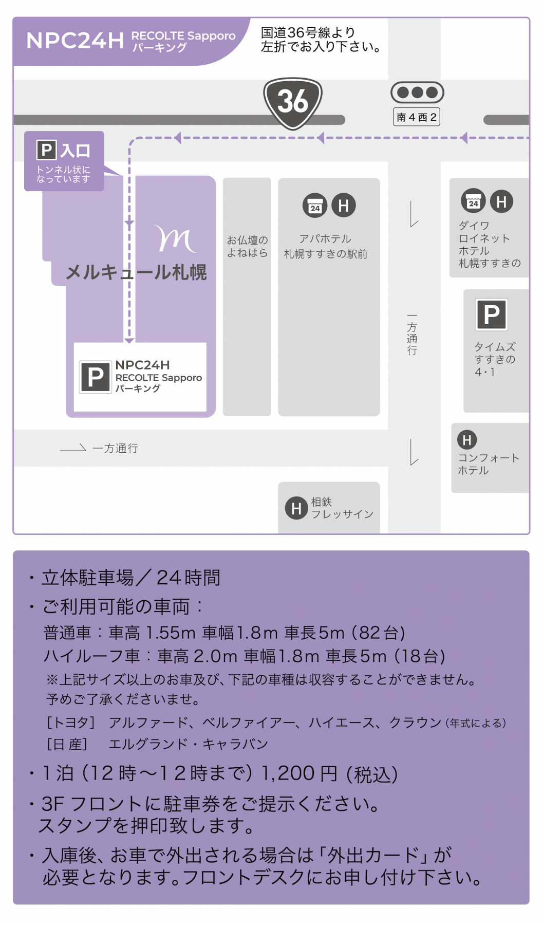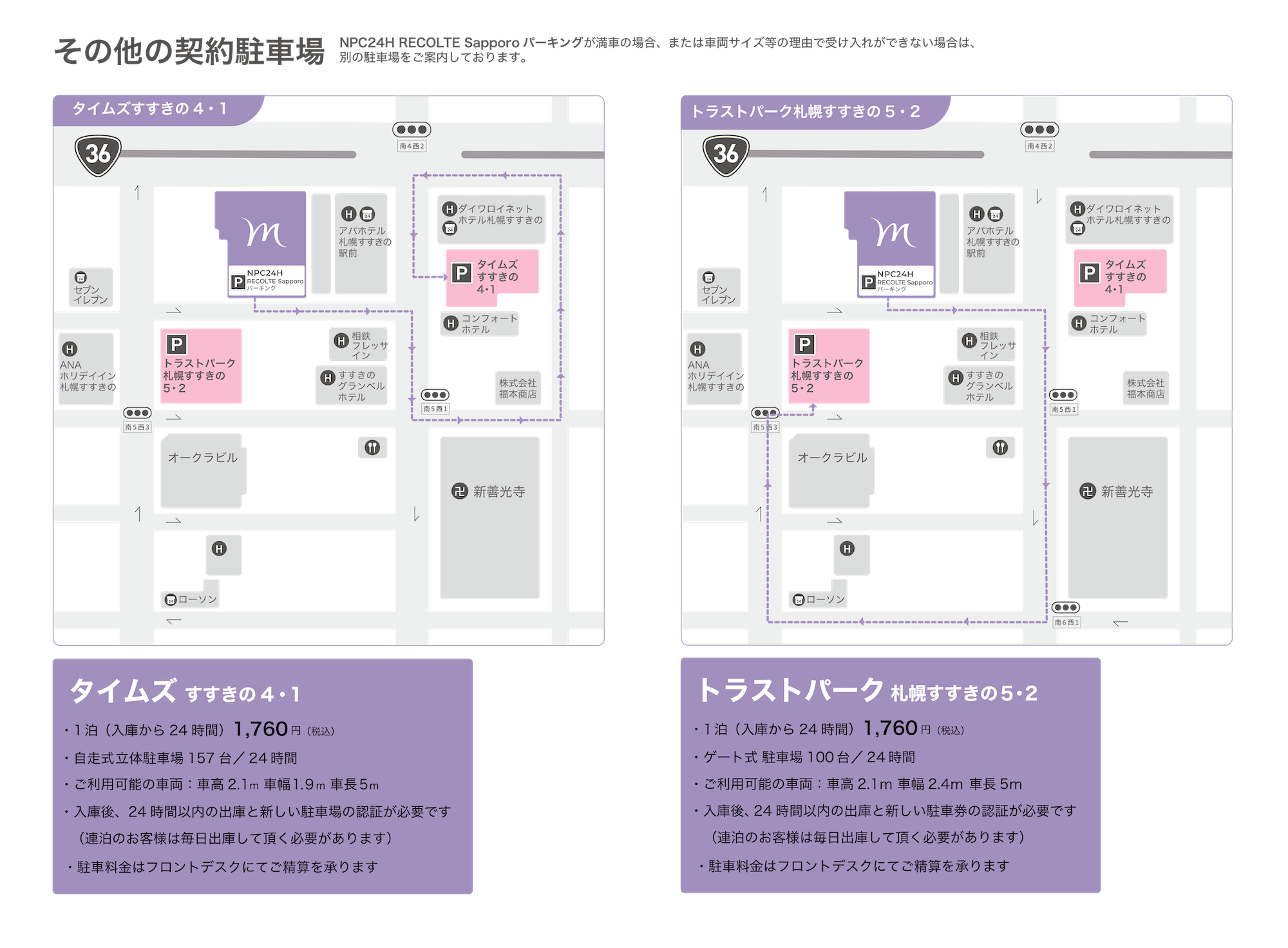 ※「NPC24H RECOLTE Sapporoパーキング」が満車かお車のサイズにより、入庫できない場合は、その他の契約駐車場をご案内致します。