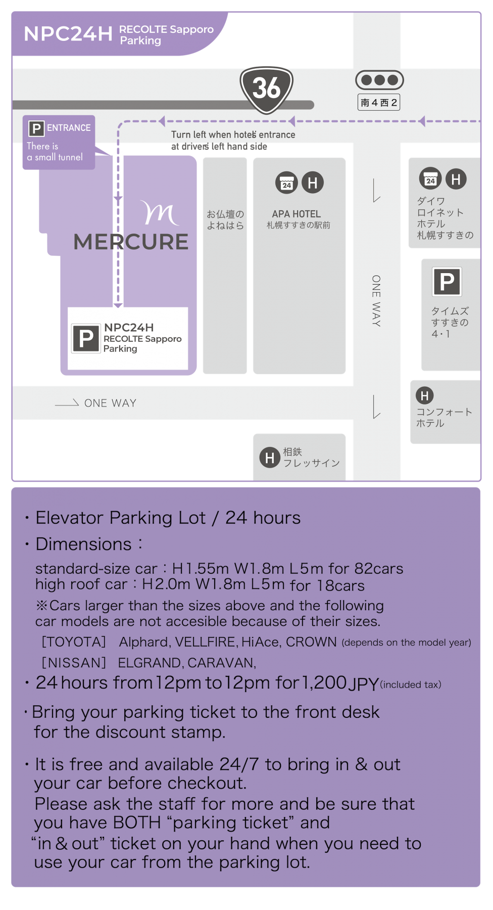 For whom need to use the elevator from the station, please go to Namboku line’s Susukino station and take the Exit 4, then turn right and 5 minutes by walk. There is no elevator at Hosui Susukino station.